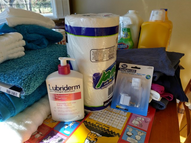 After folks got shot, punched, stabbed and trampled on Black Friday–I braved the crowds to shop for a couple local senior citizens–randomly assigned to me–I didn’t know them and they’ll never know me. I learned about the Elves For Elders program via a Facebook post on our neighborhood page. Normally I don’t like My left hand knowing what the right hand is doing, ie., others knowing what I’m doing in the world of charitable giving—I think it defeats the purpose if you shout it out for the world to see. But after this particularly deadly, greed centered start to the “holiday” shopping season, I felt compelled to give some perspective. Here is the combined list of what these 62 and 76 year old ladies asked for: Paper towels; tissues; bathroom and kitchen cleaning supplies; AAA batteries; a warm hat; crayons; colored pencils; sweat pants; t-shirt; sweatshirt; bed sheets; boxed cookies; laundry detergent; kitchen towels; pot holder; socks; slippers and a night light.